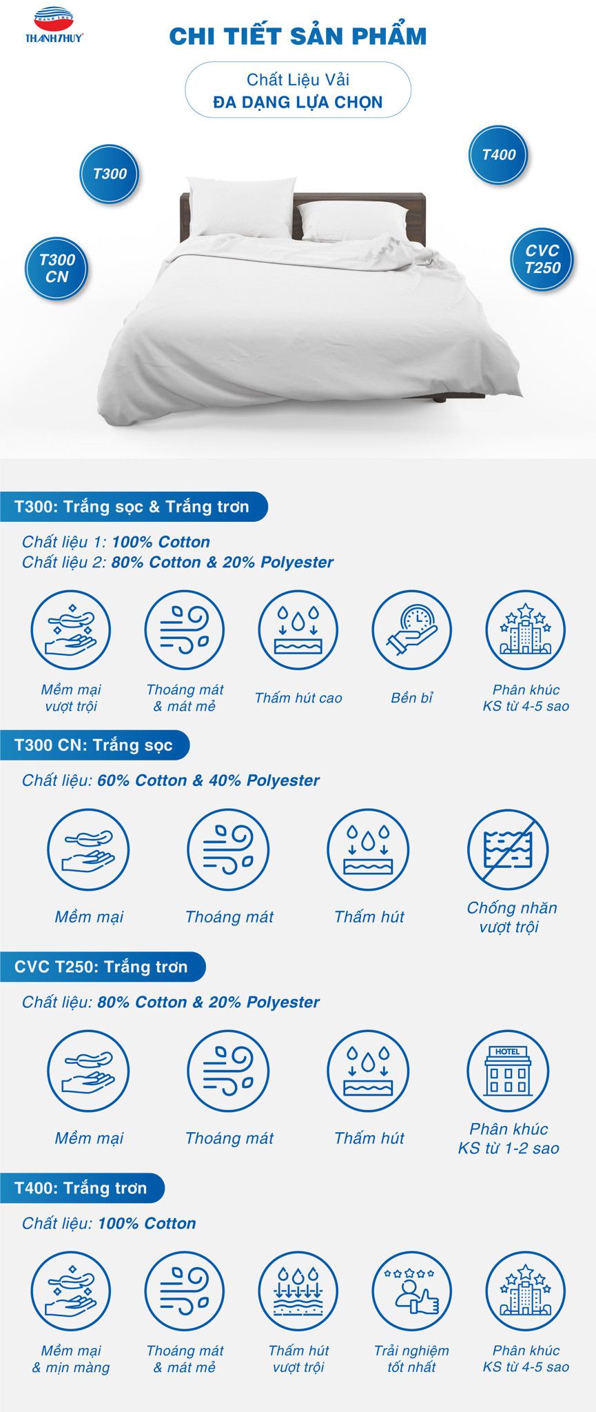 Đối với các khách sạn 3-4 sao, việc cân bằng giữa chất lượng, độ bền và chi phí luôn là ưu tiên hàng đầu. Và đây cũng chính là lý do vì sao vải T300CN có thành phần 60% cotton + 40% polyester lại trở thành một lựa chọn tối ưu.