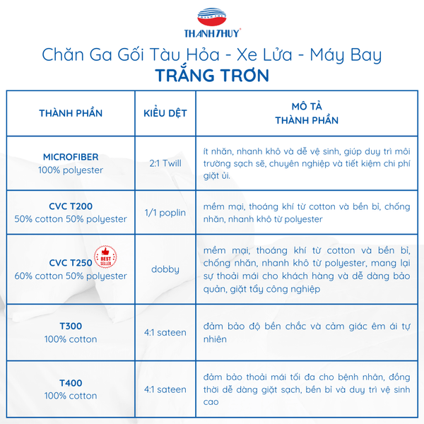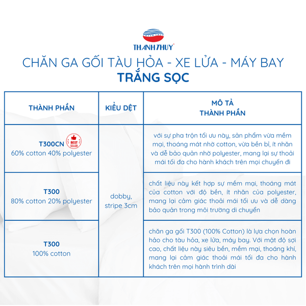 Chăn ga gối đệm cho ngành vận tải đòi hỏi sự bền bỉ, an toàn và thoải mái tối đa cho hành khách. Chăn Ra Thanh Thủy tự hào là đơn vị gia công uy tín, đáp ứng đầy đủ tiêu chuẩn chất lượng khắt khe cho tàu hỏa, xe lửa và máy bay. Với quy trình kiểm soát nghiêm ngặt từ khâu chọn vải đến sản xuất, Chăn Ra Thanh Thủy luôn mang đến sản phẩm đạt chuẩn, góp phần nâng cao trải nghiệm dịch vụ vận tải chuyên nghiệp.