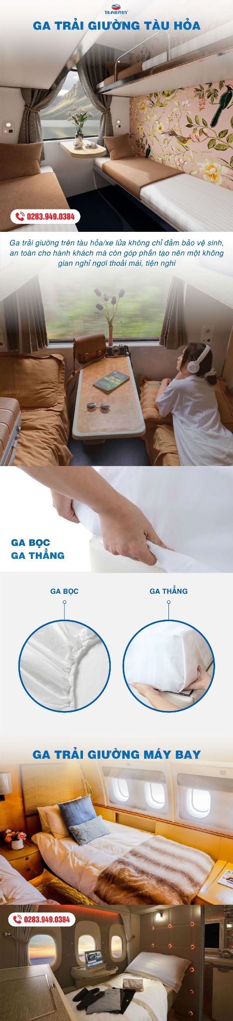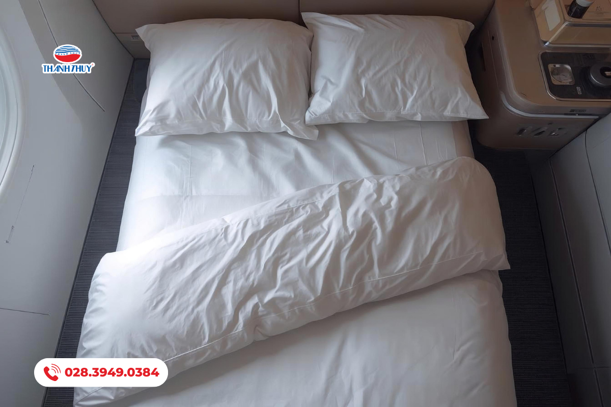 Chăn ga gối đệm dùng trên tàu hỏa, xe lửa và máy bay phải đáp ứng các yêu cầu đặc thù về độ bền, vệ sinh và sự thoải mái. Sản phẩm cần được may từ vải chất lượng cao, có khả năng kháng khuẩn, chống bám bẩn và dễ giặt nhanh khô để phù hợp với tần suất sử dụng lớn. Đồng thời, thiết kế phải gọn gàng, vừa vặn không gian hạn chế nhưng vẫn mang lại trải nghiệm nghỉ ngơi thoải mái cho hành khách.