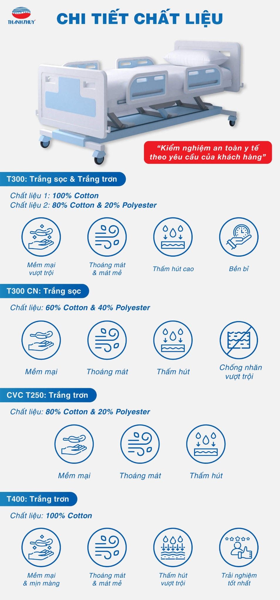 Ngoài chăn, ga, gối và khăn, Chăn Ra Thanh Thủy báo giá nhiều đồ vải chuyên dụng khác cho bệnh viện như: tấm bảo vệ nệm y tế, tấm tăng tiện nghi (topper), màn chắn buồng phòng, rèm ngăn trong phòng bệnh, đồ bệnh nhân (áo bệnh nhân / đồ mặc trong viện)…